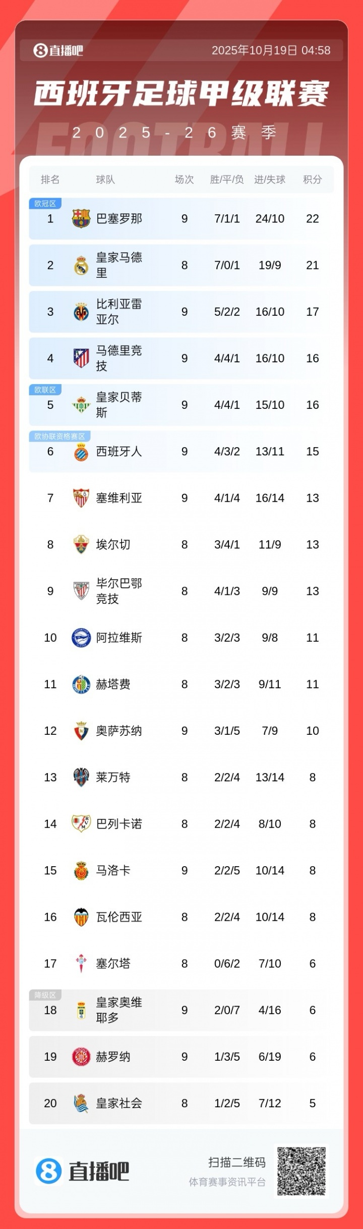 Ở vòng 9 La Liga, Barcelona đã đánh bại Girona 2-1, Betis hòa Huang Qian 2-2 trên sân khách và Atletico Madrid 1-0 Osasuna. Bảng xếp hạng mới nhất như sau: