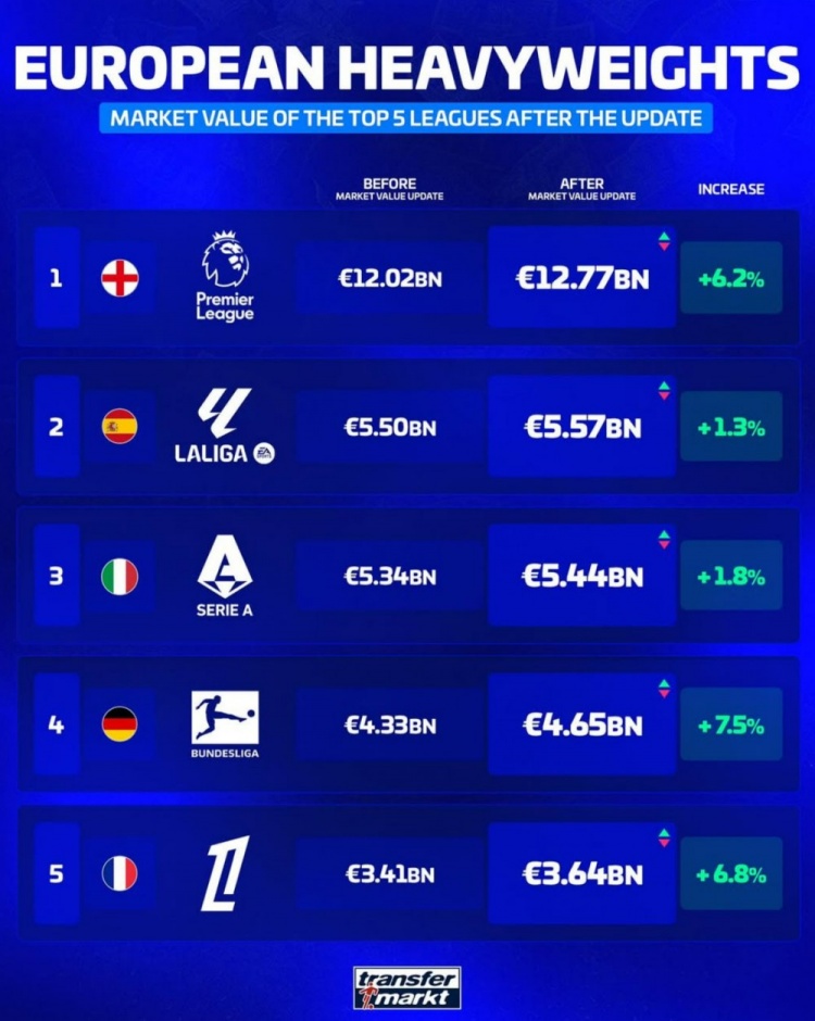 Dezhuan trước đó đã cập nhật giá trị của các cầu thủ bóng đá và xem xét tổng danh sách giá trị của 5 đội bóng lớn ở giải đấu. Trong số đó, Premier League đang dẫn trước rất xa. Sau đây là những tình huống cụ thể: