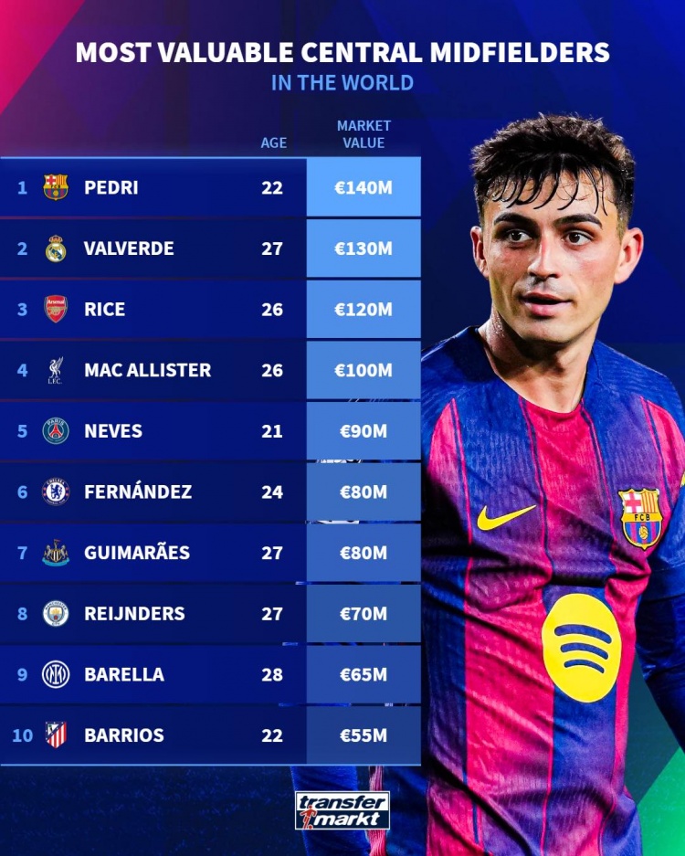 Thị trường chuyển nhượng Đức liệt kê bảng xếp hạng giá trị của các tiền vệ trung tâm, trong đó Pedri, Valverde và Rice nằm trong top ba.
