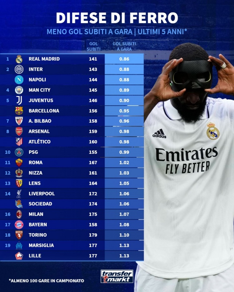Thị trường chuyển nhượng Đức đã thống kê số bàn thua trung bình mà các đội ở 5 giải đấu lớn kể từ mùa giải 2020-2021 và liệt kê danh sách những đội thủng lưới ít nhất mỗi trận. Real Madrid đứng đầu với 0,86 bàn, tiếp theo là Inter Milan và Naples.