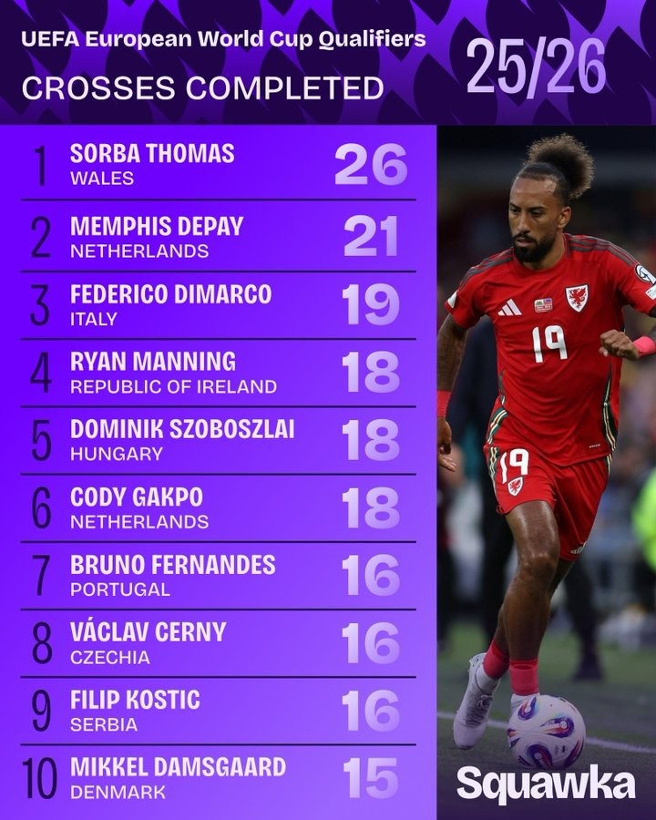 Vòng bảng vòng loại Châu Âu Thế giới này đã kết thúc. Squakwa cũng thống kê số đường tạt bóng thành công ở giải đấu này, trong đó cầu thủ chạy cánh người xứ Wales Thorba Thomas dẫn đầu.
